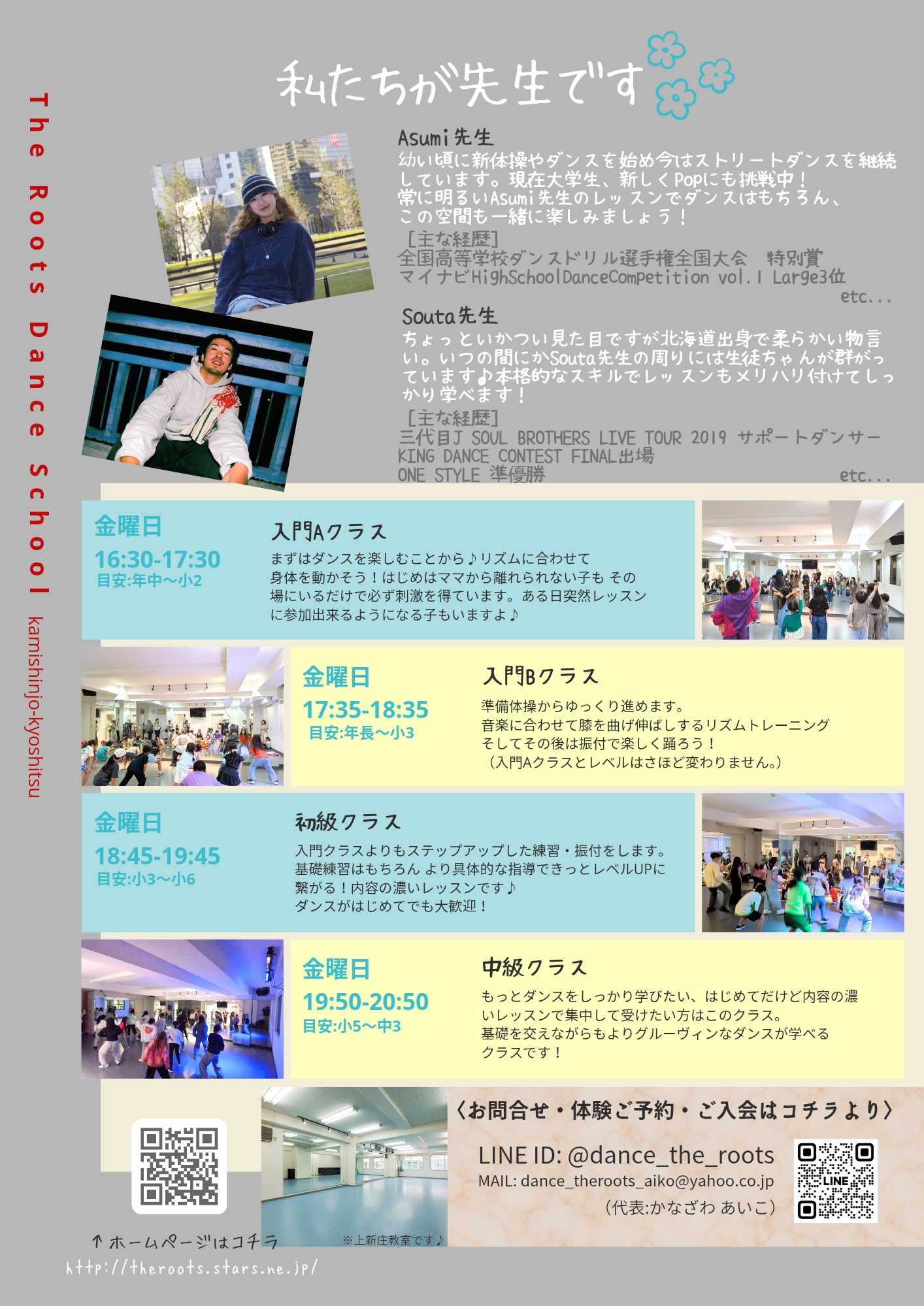 上新庄教室のクラス詳細 未分類 X Facebook はてブ Pocket LINE コピー 2026.01.25 写真は上新庄教室の4クラスの詳細です♪ 現在淡路教室の入門クラスを担当しているAsumi先生に加え、新しくSouta先生が仲間入り!TheRoots初の男の先生です。男女問わず是非一度体験にお越しください♪